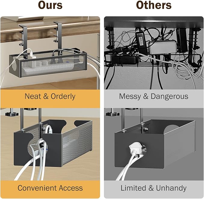 - 【Child & Pet Safe Cable Control】Protect what matters most! This cord management box keeps electrical cords safely hidden away from curious child and playful pets. The sturdy under desk cable tray design prevents accidental pulls or chewing hazards, giving you peace of mind about desk cable management safety in any family space