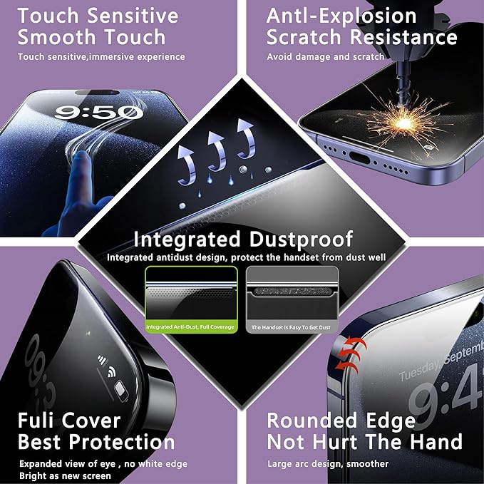 - 25° Privacy Protection: This iPhone 15 Pro privacy screen protector uses advanced anti-spy technology to keep your personal and business information safe from prying eyes in public settings. It offers top-tier privacy protection while also resisting fingerprints,water,and dust. Enjoy crystal-clear visuals,ultra-responsive touch,and a true bare-screen experience with zero delay—ideal for use on subways,buses,and other public spaces