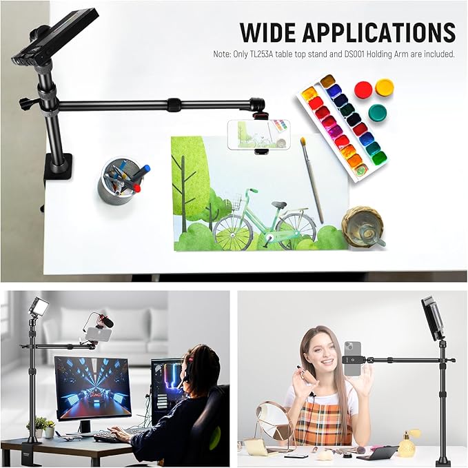 NEEWER Desk Stand with 2 Telescopic Boom Arms Phone Holder for Mic Camera Webcam Ring Light, Desktop Overhead Microphone Mount with C Clamp, Ball Heads, Screw Adapter, Cleaning Cloth, TL253A+DS001