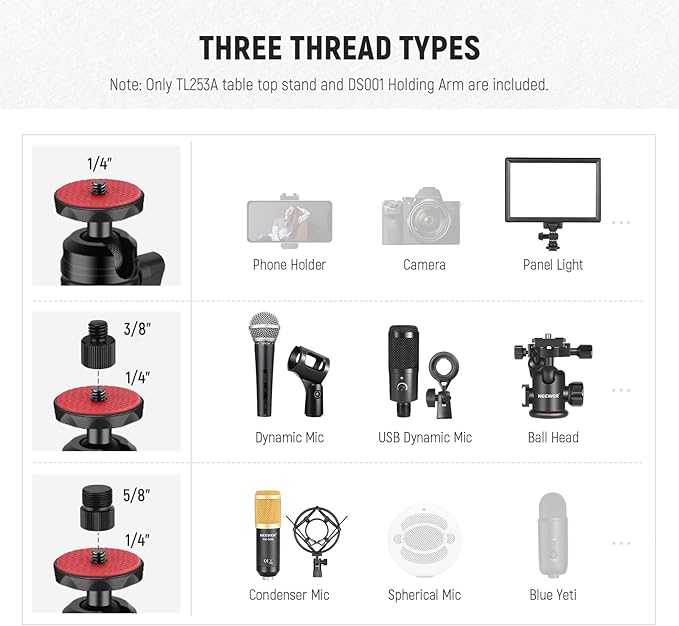 - 【Practical Screw Adapters】 Two screw adapters (1/4" to 3/8" and 1/4" to 5/8") allow you to mount a variety of devices and accessories for versatile uses, such as Zoom calls, video conferencing, podcasts, gaming, live streaming, for YouTube/TikTok videos, online lessons and more. Ideal as content creator essential camera gear, microphone mic stand, influencer must have photography accessories and equipment