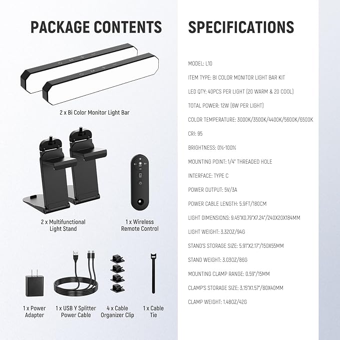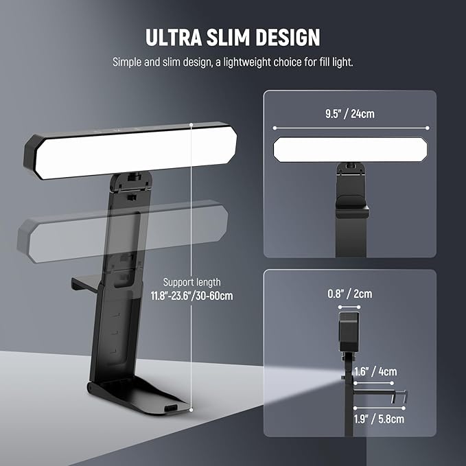 - 【Bi Color & Dimmable Video Call Lights】 The desk monitor tube light has built in 40 LEDs ( 20 warm & 20 cool LEDs) to to emit both warm and cool light. It offers 5 levels of color temperature (3000K, 3500K, 4400K, 5600K, and 6500K) and 10 brightness levels to accommodate different lighting conditions. The memory function retains the last used settings for color temperature and brightness, so you don't have to reset them unless necessary
