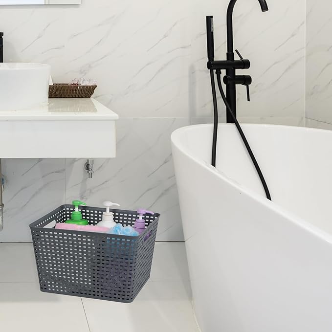 - Each plastic basket is equipped with a concave lid, which helps stack them together to effectively utilize vertical space