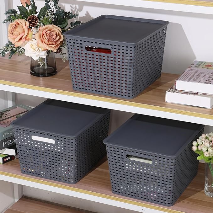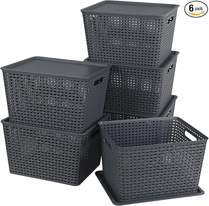 Anbers 6 Pack Plastic Weave Basket for Shelves, Stackable Storage Basket with Lid, Dark Grey