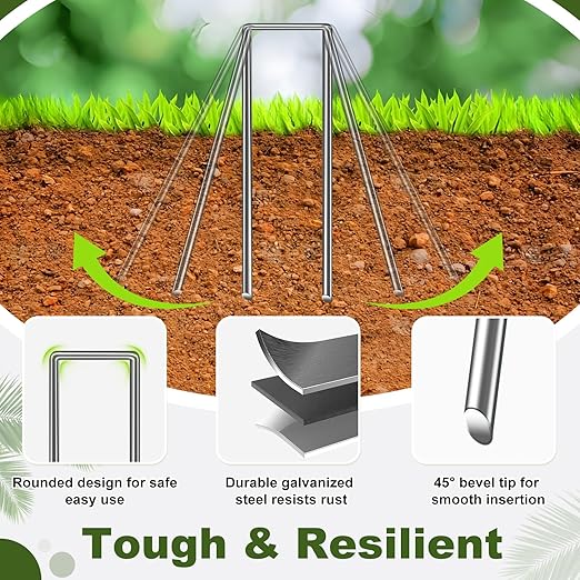 - U-shaped Garden Staples: Our landscape staples feature a U-shaped design that helps tighten the soil and hold it firmly in the ground. The width at the end of the garden stake is adjustable to suit a variety of needs