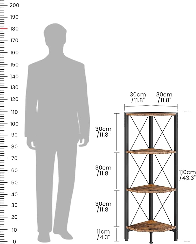 4-Tier Corner Shelf, Corner Bookcase, 43.3" Tall Vertical Display Rack, Plant Stand, Open Storage Shelf, for Living Room, Bedroom, Study, Kitchen, Rustic Brown and Black TCJ14BF