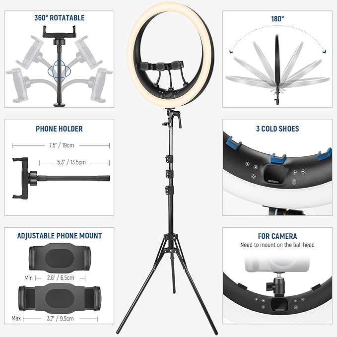 - 【Touch Screen & LCD Display】 This standing halo ring light with stand as studio lighting kit equipment features a responsive touch panel and a built in LCD display for intuitive adjustment of brightness and color temperature. The LCD screen clearly shows current luminance and color temperature levels, making professional continuous lighting setup quick and efficient
