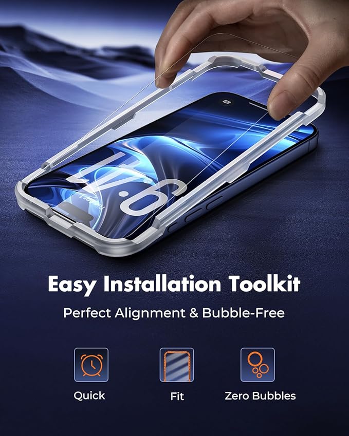 - Super-Easy Installation: This screen protector kit includes an installation frame, alcohol wipes, dust removal stickers and absorbers, a microfiber cloth, and a guide. Perfect alignment is effortless, even for beginners.