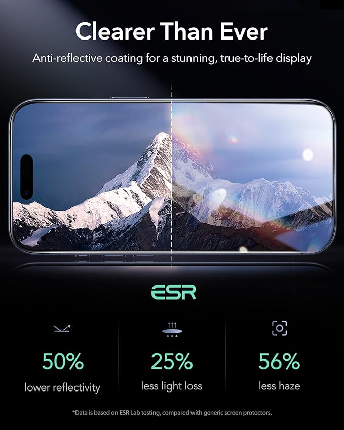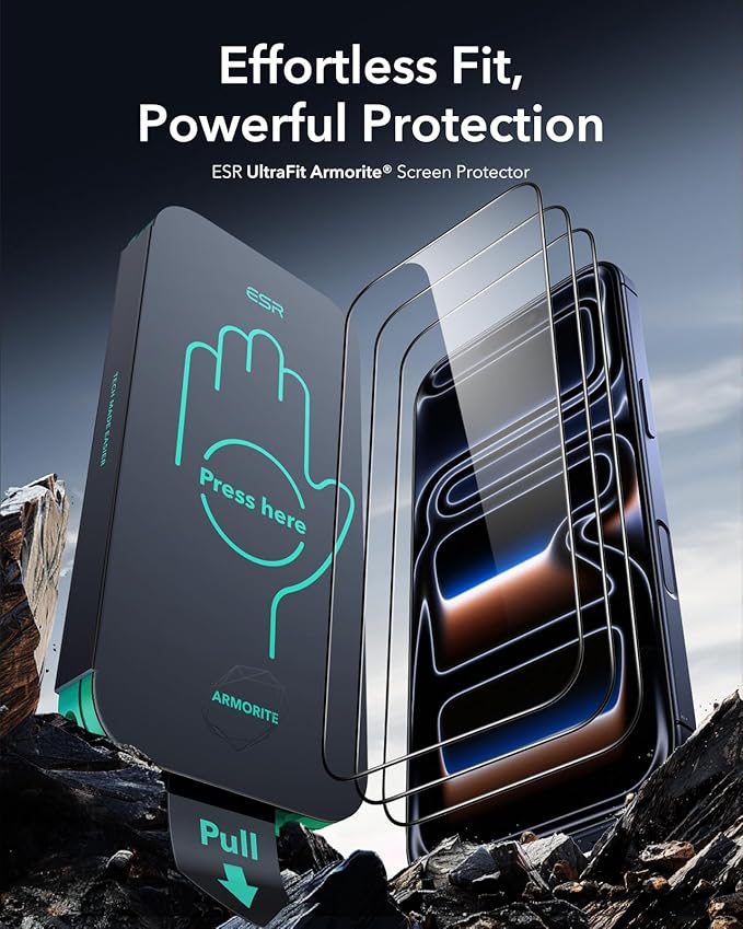 - In the Box: ESR Armorite Screen Protectors (3 pack, only for iPhone 17 Pro), UltraFit tray, cleaning kit, and manual