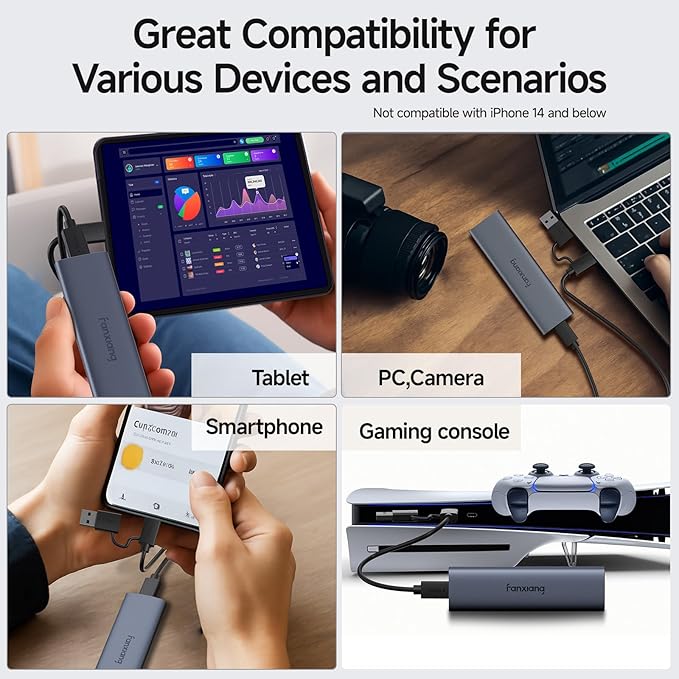 - Direct 4K ProRes Recording for iPhone : Record 4K ProRes video directly to this solid state external hard drive using your iPhone. Note: Exclusively compatible with iPhone 15 series and newer (USB-C port required). Connect using the included high-speed USB-C cable, open Files > Browse > PS1008, and instantly manage your files — no app, no setup, just plug and go