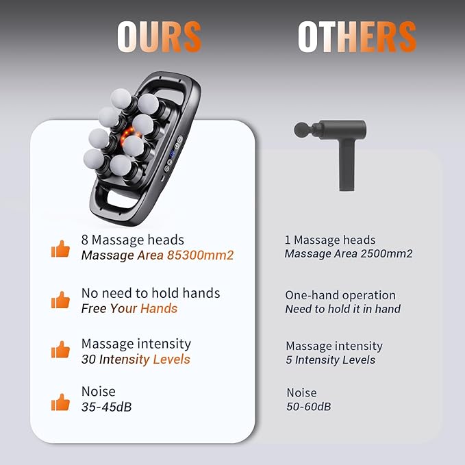 - 8 Head Massage Gun Deep Tissue: Tired of 1-head massagers that only work on small spots? Our 8 head design offers an expansive 85,000mm² coverage—way more than traditional single-head options. It massager over large muscle groups like your back, neck, and shoulders, so you can hit all body without constant adjustments.