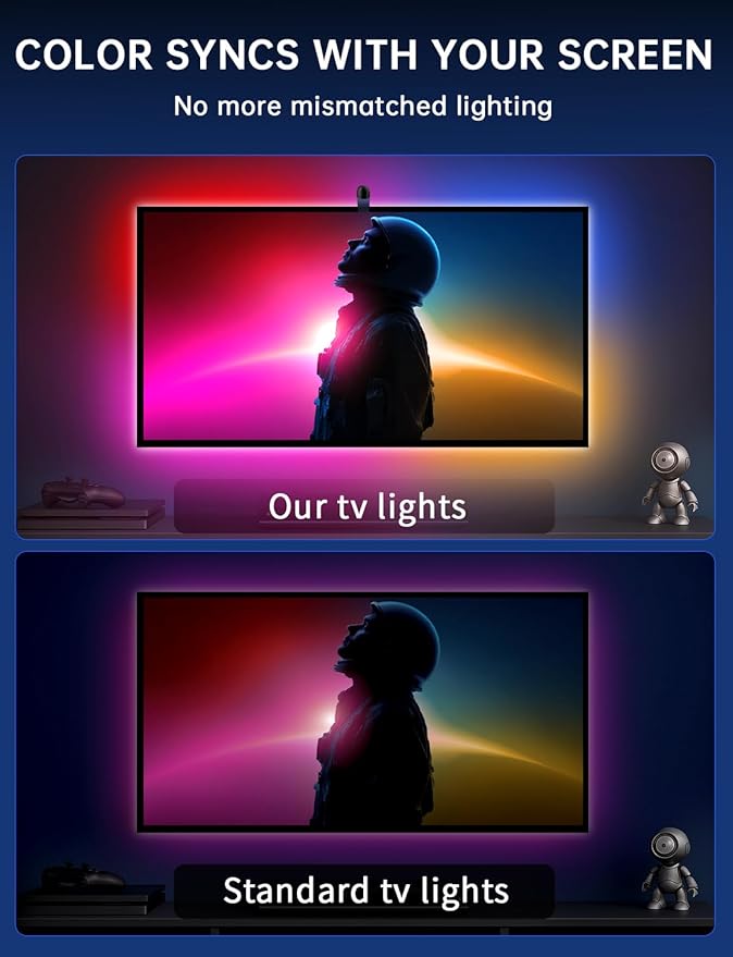 - 【Real-Time Sync TV LED Backlight for an Immersive Experience】 Enhance every scene with tv backlight sync to screen technology. Our dual-core sensor and 0.05s sync engine allow these LED lights for TV to mirror on-screen visuals instantly—adding depth, contrast, and atmosphere. Ideal for movies, games, and sports nights.