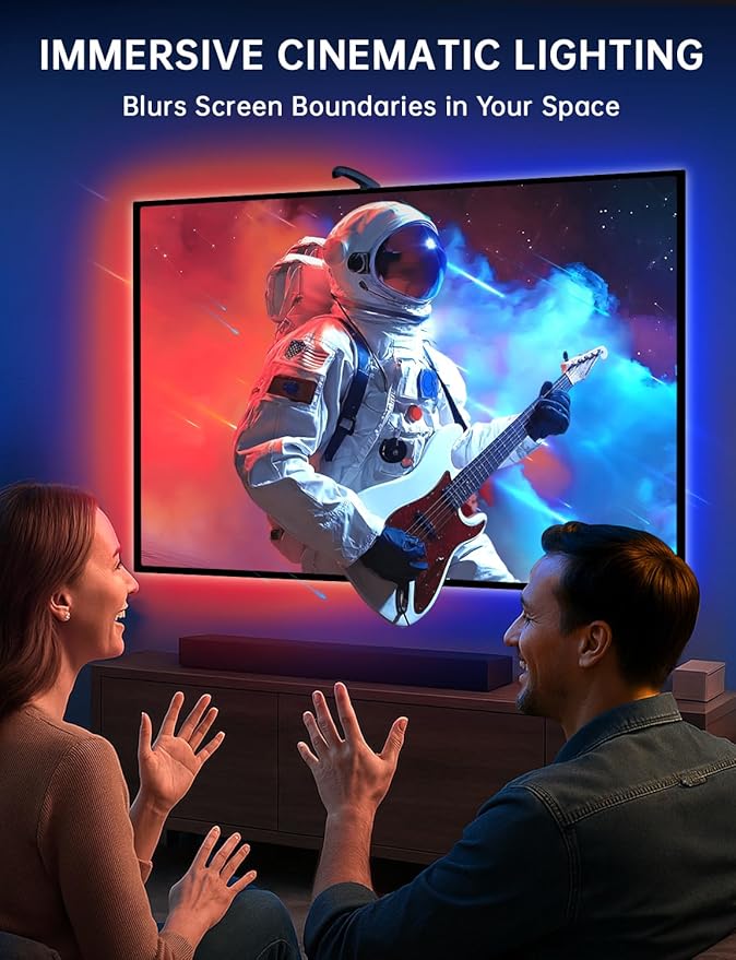 - 【High-Density Behind TV LED Lighting with Easy Setup】 Each strip features 60 LEDs per meter for smooth, detailed ambient glow. Advanced fisheye calibration ensures accurate screen-edge detection. Includes a clamp-on top sensor, strong adhesive, and 12 brackets—ideal behind TV LED lighting for 75-85" ultra-thin TVs (≤1.9"). Quick to install, built to last.