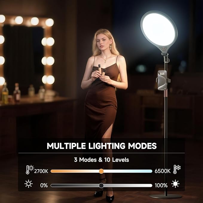 - Versatile Desktop & Floor Stand Options: The round base design offers stability for both desktop use and floor positioning. Whether you need a compact setup for close-up work or full-height configuration for standing shots, this ring light with stand and phone holder adapts to your creative needs