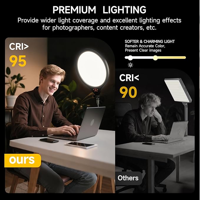 - High Performance LED Technology: 224 premium LED beads deliver bright, even illumination with 24W power consumption. The camera lighting for video recording provides consistent, flicker-free light that's gentle on eyes during extended use, ideal for makeup application and portrait photography