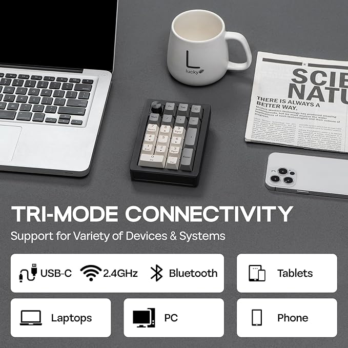 - Triple Modes&1000mAh Large Capacity Battery: The EK21 offers exceptional versatility with its triple connectivity options. Choose from wired, Bluetooth, or 2.4GHz wireless modes to suit your preferences and enhance your productivity. This numpad is not just about connectivity; it also features a robust 1000mAh battery capacity, providing you with extended usage time without the inconvenience of frequent recharging. Enjoy consistent performance and stay focused on your tasks throughout the day, knowing that the EK21 is designed to keep up with your demands. Whether you're working at your desk or on the go, this device ensures seamless operation tailored to your needs