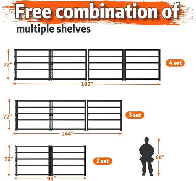 - DIY Combination & Adjustable Storage Shelving Unit: The height of each layer of the 5-tier heavy duty garage storage shelving unit can be adjusted according to the height of the item's organization, It is equipped with adjustable connectors, can be assembled or disassembled into several different metal shelving. You can split it according to actual needs and achieve multiple purposes, storage shelving is perfect for organizing all sorts of items in your garage, kitchen, or laundry room