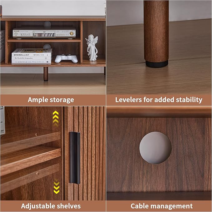 - 【Stylish Design】 This mid-century modern TV console is adorned with curved sliding doors decorated with grooved vertical stripes and metal handles. The unique design adds a touch of elegance to any living room or bedroom decor. The fluted cabinet is available in walnut, natural colors, providing options to match your personal style