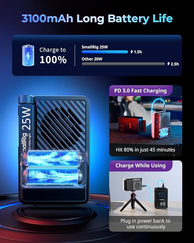 - PD Fast Charging: Powered by a robust 3100mAh battery, 50 mins runtime at full brightness (or 4+ hours on low). With USB Type-C charging port, hit 80% in just 45 minutes. The SmallRig RGB video light for phone can be used continuously while charging with automatic overheat protection.