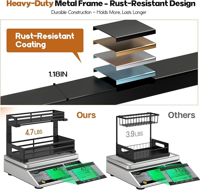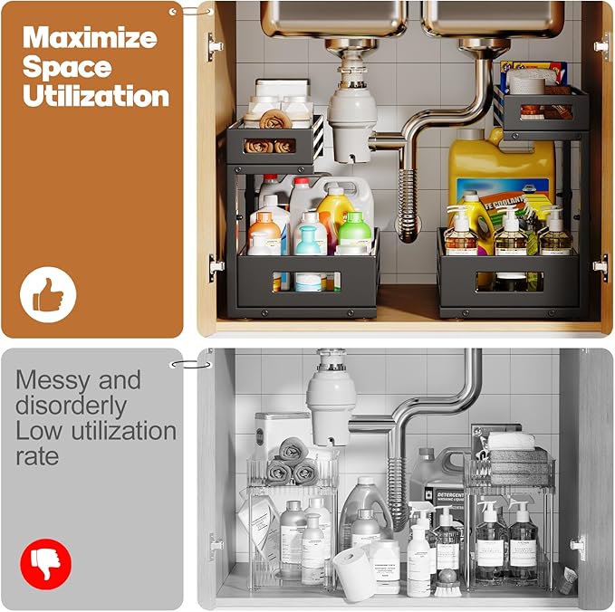 - 【Sturdy metal sheet frame& Rust-Proof】The under sink organizer is built from solid metal sheets with a strong frame and superior rust-resistant design, making it durable and ideal for long-term use in humid areas like kitchens,bathrooms and Laundry Room.