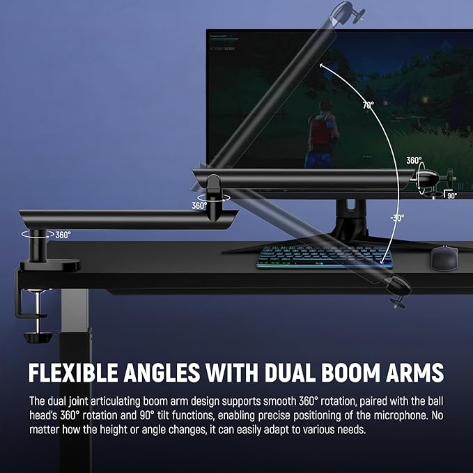 - 【Flexible Angles with Dual Boom Arms】 The two articulating boom arms enable smooth 360° rotation, quick adjustments, and silent movements without distracting noise. The upper arm offers a pitch range of +70 to -30 degrees, accommodating various microphone sizes and positions. Besides, the ball head supports 360° rotation and 90° tilt, effortlessly positioning the microphone wherever you want