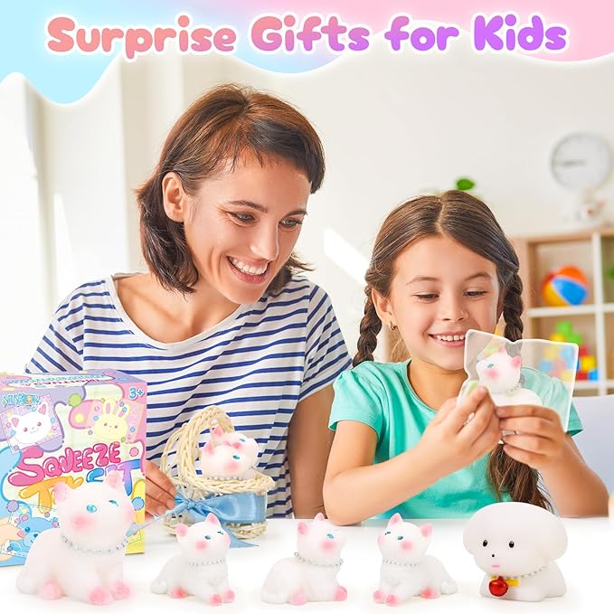 - Squishy Cat Toys Set: This value pack includes 1 cat, 3 kittens, 1 cat's nest, 1 puppy. The cute and lively designs bring endless joy, and the soft texture provides an extremely soothing tactile experience. Perfect for role playing and creative play, bringing players a fun interactive experience