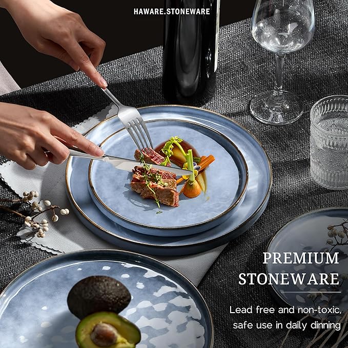 HaWare Dinnerware Sets, 6-Piece Plates and Bowls Set, Stoneware Dish Set for 2, Ceramic Dinnerware for Home Restaurant, Chip and Scratch Resistant, Microwave and Dishwasher Safe, Reactive Blue