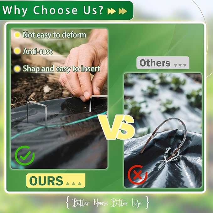 - **U-Shaped Garden Stakes**: 6-inch heavy-duty galvanized garden stakes, Reusable for 3-5 years. Ideal for securing landscape fabric, turf, and weed barriers, ensuring stability for outdoor projects in all weather conditions.