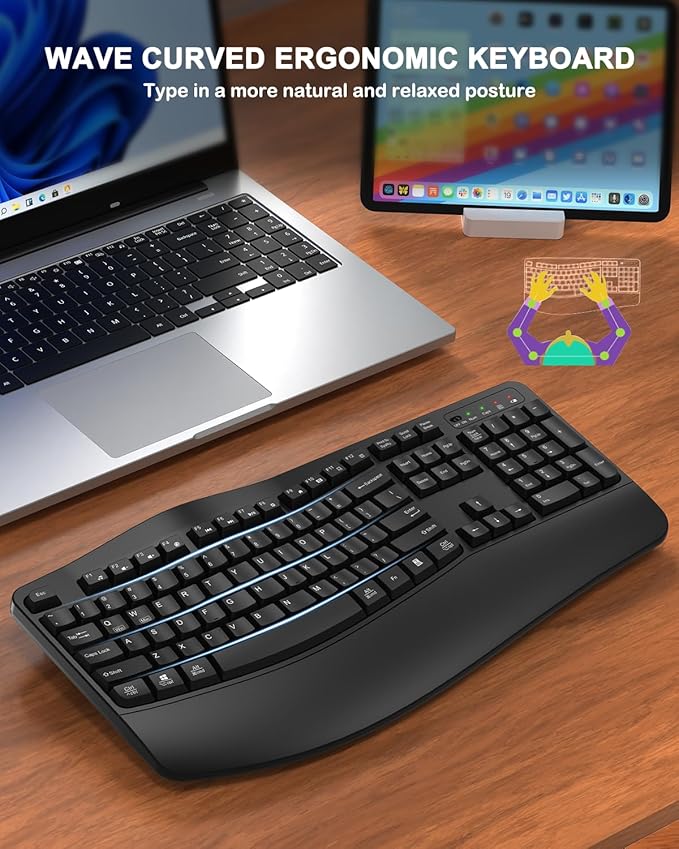 - 【ERGONOMIC WAVE DESIGN, ALL-DAY COMFORT】This wireless ergonomic keyboard with innovative wave design, based on feedback from RSI(Repetitive Strain Injury) patients, effectively reduces muscle tension and increases comfort. The gracefully arched, wave-shaped key layout invites your hands into a natural, ergonomic position, allowing you to type with ease while maintaining a healthy arm angle. It minimizes strain on hands, wrists, and shoulders.It stands as an ideal gift to convey your affection and care for loved ones.