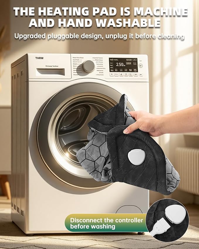- ETL Certified Safety & Auto Shut-Off for Peace of Mind- This ETL-certified heating pad features built-in overheat protection for added safety. If you forget to set a timer, the pad will automatically shut off after 30 minutes, ensuring safety and preventing overheating. The weighted edges and snap fasteners keep the pad securely in place while you move, providing comfort without readjustments.