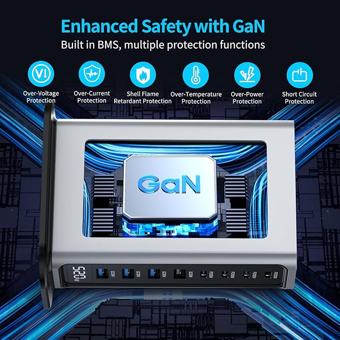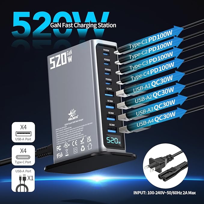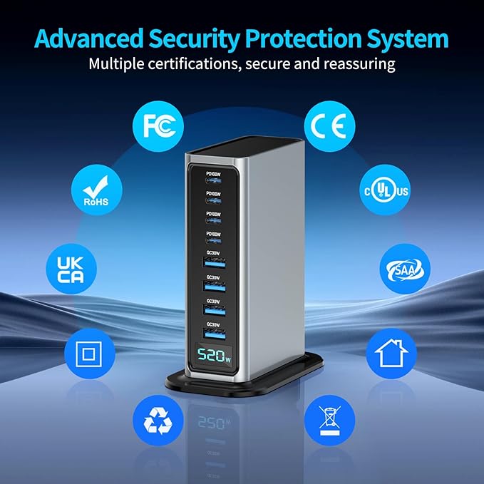 - 520W Total Output & Fixed LED Display :All 8 ports deliver combined 520W max power for simultaneous fast charging. Features a fixed-brightness LED display (non-variable) – sleek visual indicator for this USB C charging station.