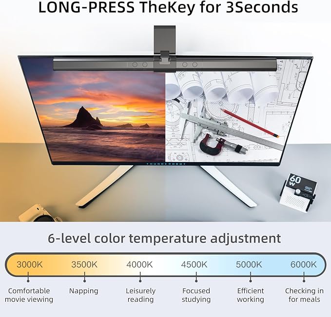 - Six Color Temperatures Offering a versatile range of six color temperature options, from cool white to warm yellow, this lamp can be seamlessly adapted to suit various scenarios and personal preferences. Whether you need a focused, productive environment or a cozy, relaxing ambiance, the flexible color temperature settings allow you to create the perfect lighting atmosphere for any occasion.