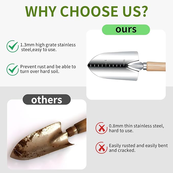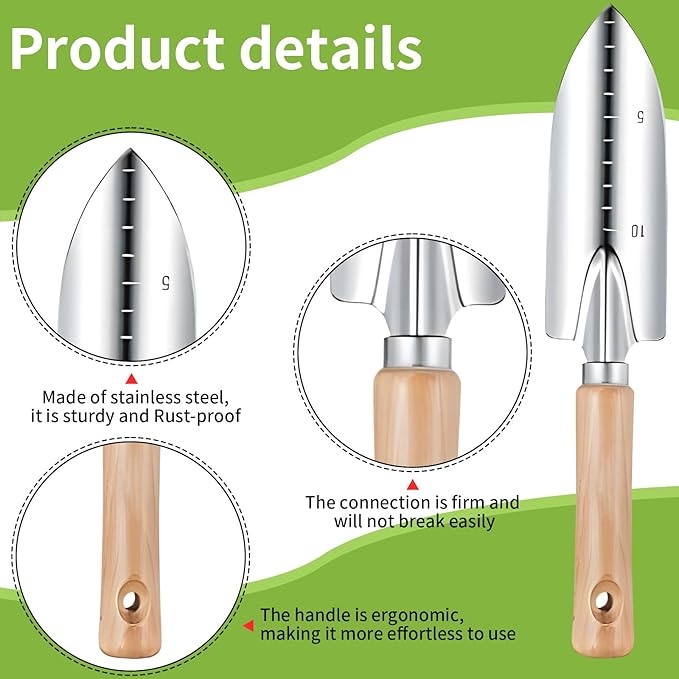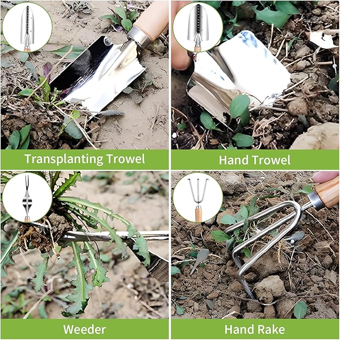 - Sturdy and Rust-proof Construction: Made of high-grade stainless steel, ensuring that the tools are rust-proof, sturdy, and resistant to corrosion. Perfect for all-season gardening supplies, from planting to pruning! Stainless steel garden tools are easier to fix up your garden.