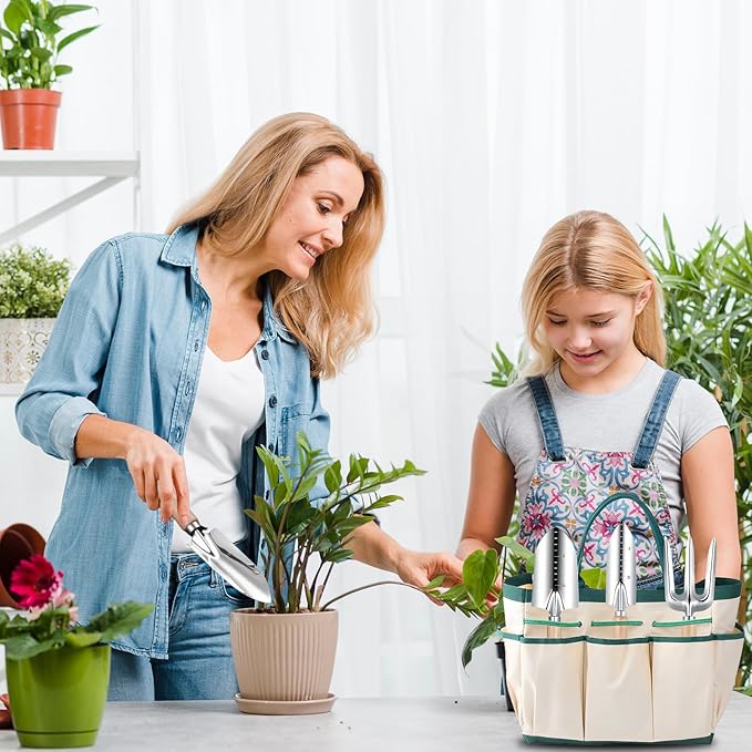 - 11-Piece All-in-One Gardening Tool Set: Includes 8 gardening hand tools (weeder, hand rake, transplanter, cultivator, trowel, pruner, gloves, spray bottle) , a kneeling pad, apron, and a multi-pocket tote bag . The variety of tools ensures that you can tackle any gardening task with ease.