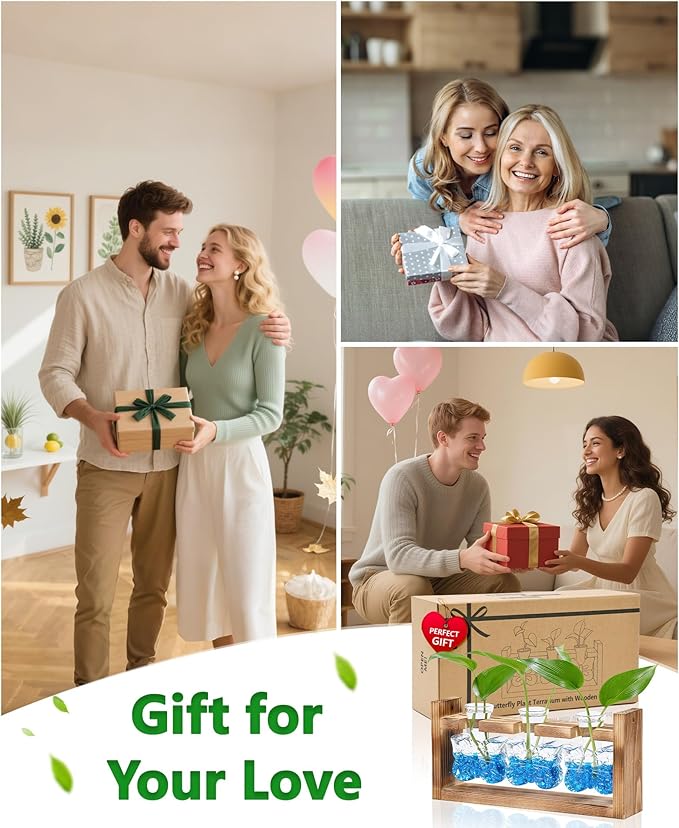 - Thoughtful Propagation Set:Our Butterfly-Shaped plant terrarium includes Natural wood stand, 3 star vases, cleaning brush, 200g decorative stones, illustrated guide. Everything for instant hydroponic setup! Transparent glass showcases mesmerizing root growth
