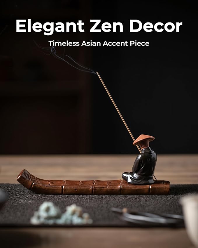 - Zen Design — This artistic incense burner features a hand-sculpted Kung Fu monk wearing traditional bamboo hat, with eyes peacefully closed in meditation. One hand securely holds the incense stick while the other forms a classic prayer gesture, available in both standing and seated poses to suit your space.