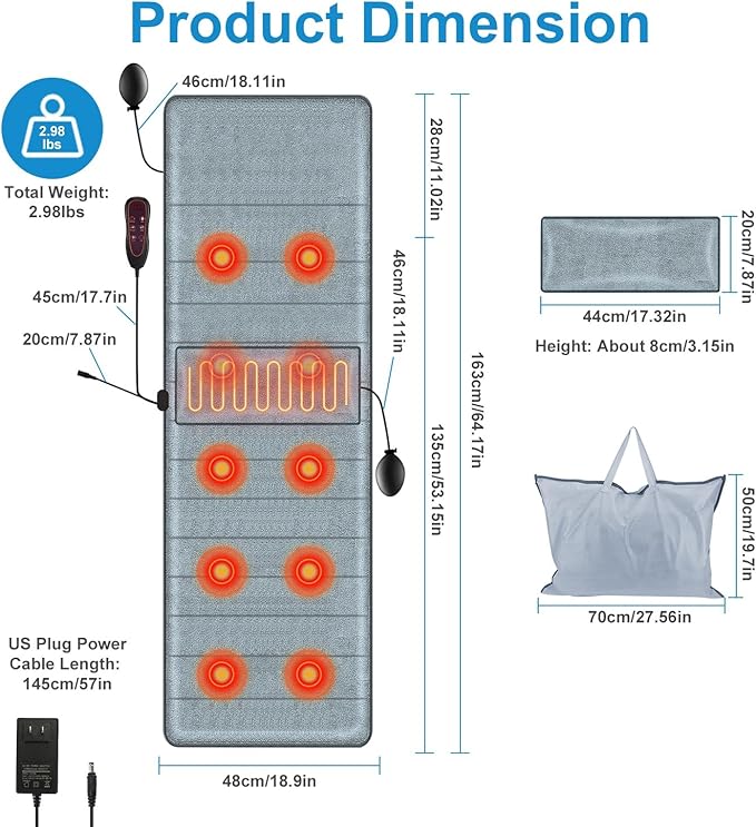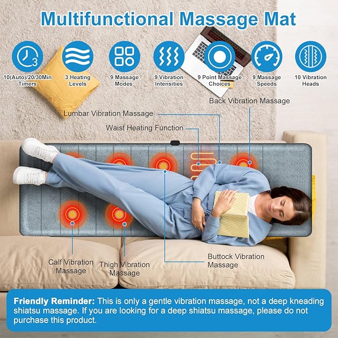 - 【Full Body Relaxation】This full body massage cushion is equipped with 10 massage heads, covering the back, hips, waist, thighs and calves. This smart massage cushion allows you to fully immerse yourself in 9 modes, 9 point selections, 9 vibration intensities, 9 speeds, 3 heating and 3 time intervals, effectively helping you relieve stress, tension, and eliminate fatigue after long hours of work. This is just a gentle vibration massage, not a deep kneading acupressure massage. If you are looking for a deep acupressure massage, please do not buy this product.