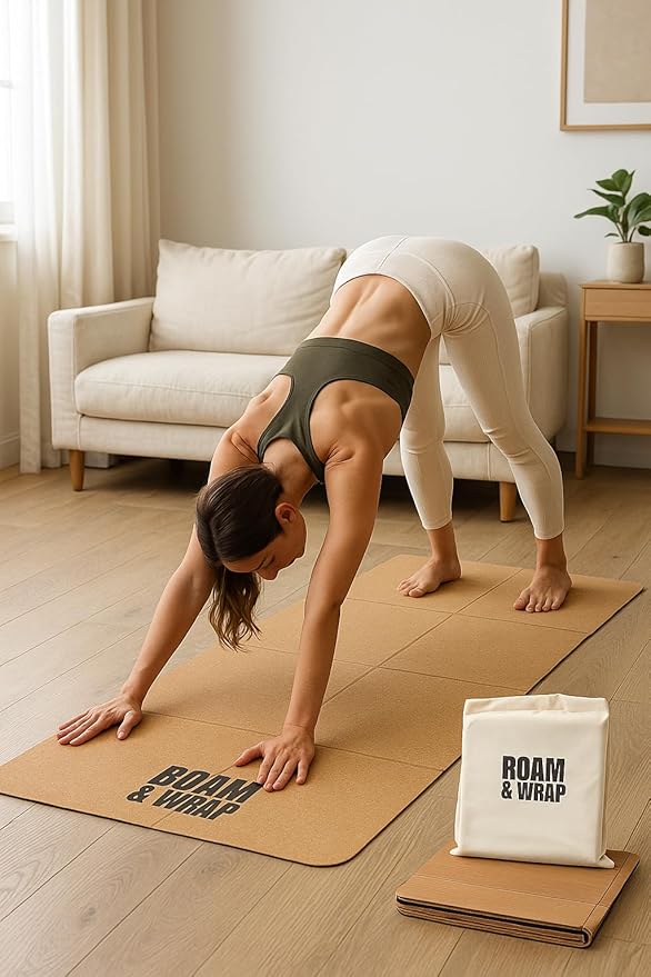 Roam & Wrap Foldable Cork Yoga Mat – Compact 14-Panel Travel Mat, Lightweight & Easy to Carry, Fits in Bag with Carry Pouch, Non-Slip Cork top & TPE bottom, Cotton Bag Included (4mm)