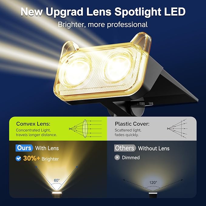 - Brighter Focusing LED & Long Lasting: Equipped with two high-power LED and upgraded optical convex lenses, solar spot lights outdoor provide brighter, more focused light. Solar lights outdoor feature a 1200mAh high-capacity battery for long-lasting performance. In high light mode, solar spotlight offer up to 12 hours of continuous illumination, while low light mode extends this to 20 hours. Whether lighting up your garden or yard, solar outdoor lights ensure reliable, long-term outdoor use