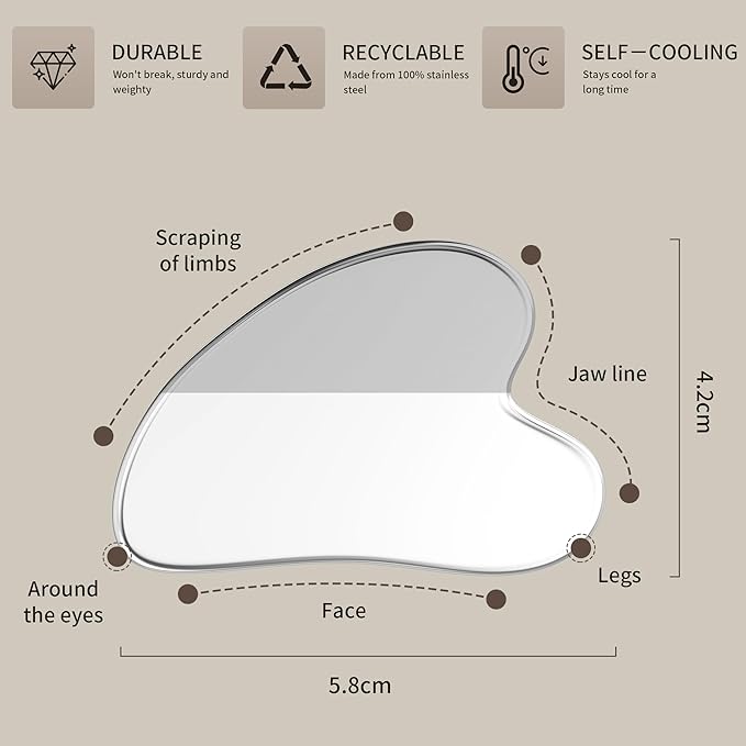 - Premium Stainless Steel Construction – Crafted from high-quality stainless steel, this gua sha tool glides smoothly over skin with or without oil, offering better durability and hygiene than traditional stone tools.