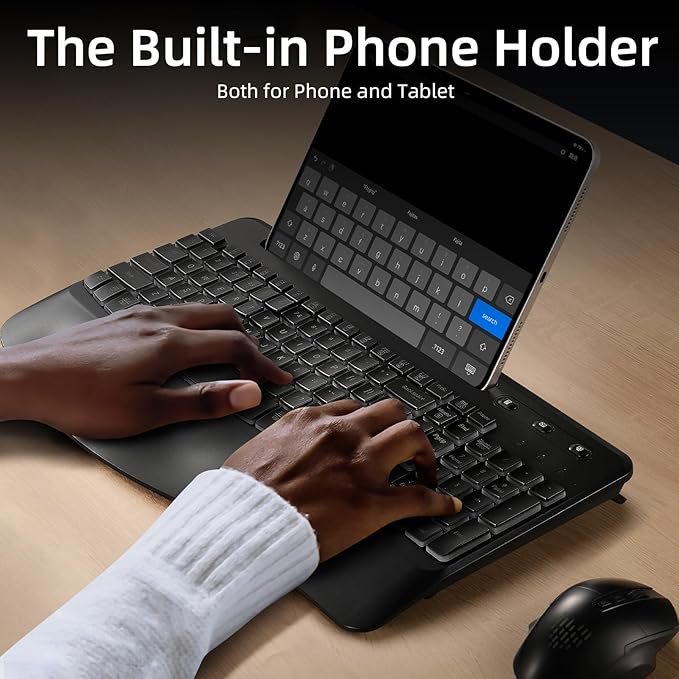 Hamile Wireless Keyboard and Mouse Combo : Ergonomic Wave Keys for Natural Typing, Full Size Keyboards with Wrist Rest, Quiet Backlit Mice,Phone Holder, 2.4G Set for Computer/Laptop/Mac/Windows, Black