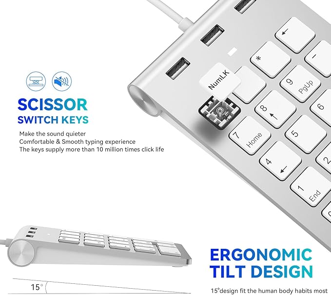 - 【Ergonomic Design for Fatigue-Free Typing】Engineered for comfort, this numeric keypad features a 15° tilted design and responsive scissor-switch keys to promote a natural wrist posture. Enjoy precise, quiet typing during extended data entry sessions—ideal for accountants, programmers, and spreadsheet professionals.