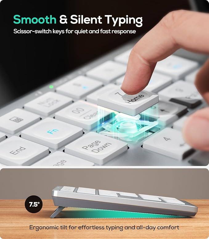 - Ergonomic Bluetooth Numeric Keypad for Enhanced Productivity:Engineered with silent scissor-switch keys and a 7.5° tilt, this number pad for laptop delivers tactile feedback and quiet operation—ideal for accountants, data analysts, and financial teams. The full-size numeric layout ensures rapid data entry without compromising desk space