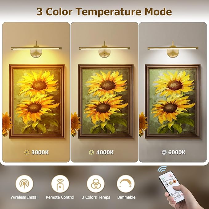 - Modern Picture Light with Remote Control – This elegant picture light in gold finish brightens up your wall art, photography, and décor with soft and adjustable lighting.