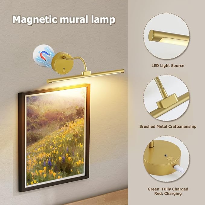 - Wireless & Battery Operated for Flexible Use – Enjoy the freedom of cordless installation. These picture lights for wall battery operated are fully rechargeable and require no wiring.