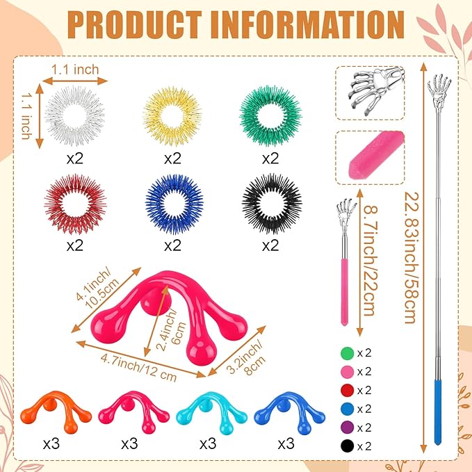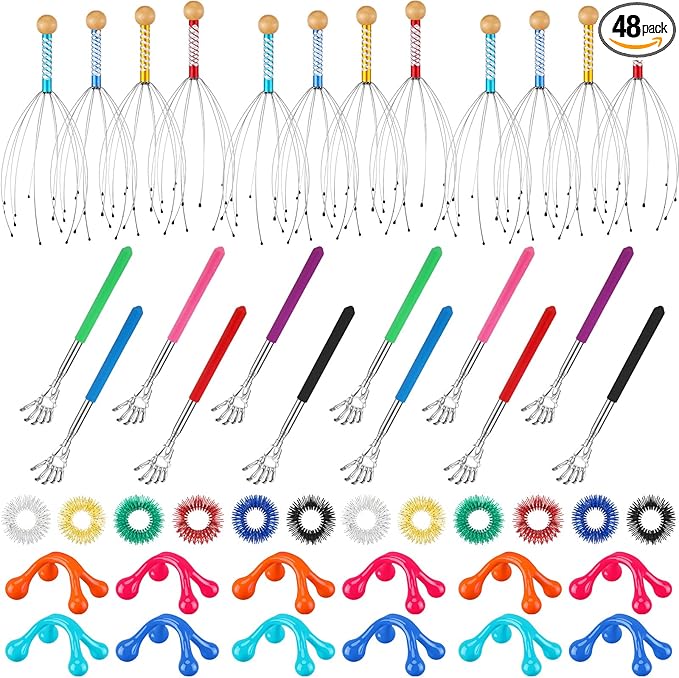 - Complete Massage Set: our massage set contains 48 pieces of 4 different styles of body massage tools, including 12 head scratcher scalp massagers, 12 extendable back scratchers, 12 finger massage rings, and 12 four point massage knobs, with a wide variety to meet your various massage needs; Please note that the head scratcher scalp massagers are shipped in mixed colors