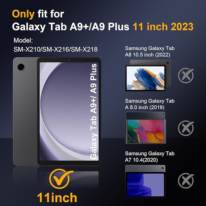 - Compatibility:Specially designed case for Samsung Galaxy Tab A9+/A9 Plus 11 inch (Model: SM-X210/SM-X216/SM-X218) 2023 Release. Note: Not applicable to any other model.