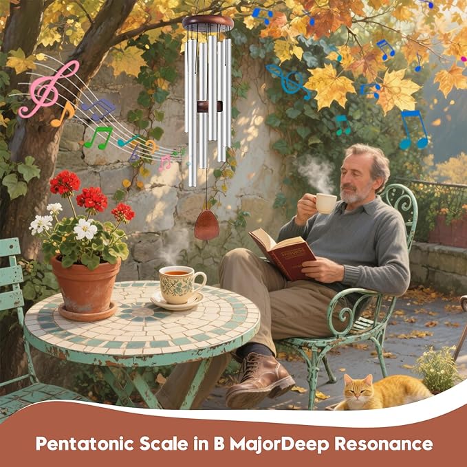 Aluminum Wind Chimes for Outdoor Garden and Yard with Soothing Deep Tones, Creates a Peaceful Ambiance with Sophisticated Wind Catcher, Ideal Calming Gift for Families (Silver, 37 Inches)