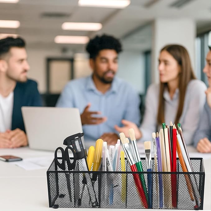- 【Multi-Compartment Organization】With 6 spacious compartments, this metal mesh pen holder allows you to categorize and store various items efficiently. Whether it’s pens, markers, scissors, or makeup brushes, the divided sections help maintain a clutter-free workspace. The design promotes easy access to essentials, saving time and enhancing productivity in any setting.