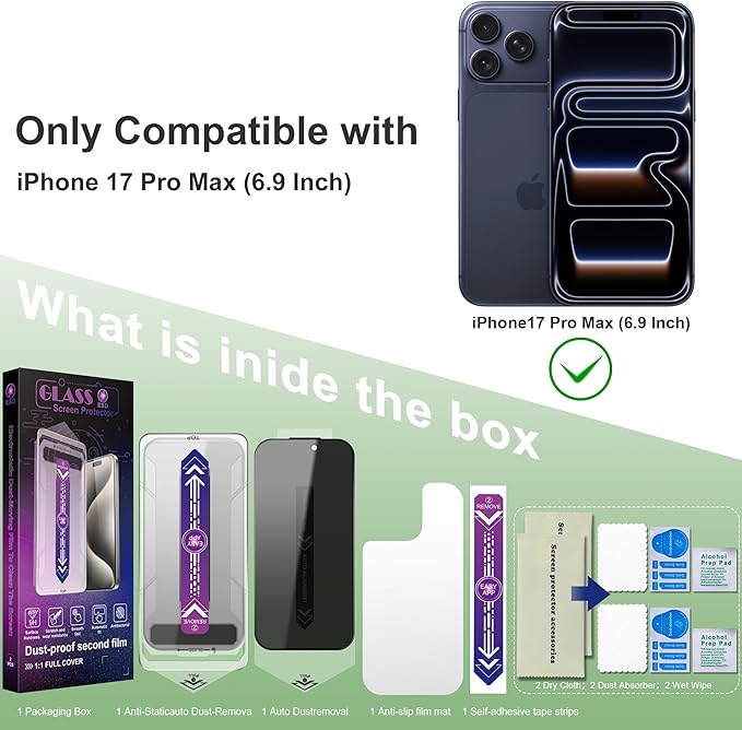 - Screen Protector Compatible with iPhone 17 Pro Max: Designed for your iPhone 17 Pro Max screen protection, 100% touch accurate. Not compatible with other iPhone models