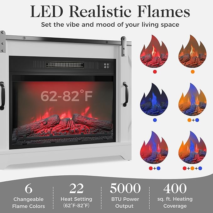 - Customizable Flames and Adjustable Temperature: Our LED electric fireplace pumps out 5000 BTU, wrapping a 400 sq. ft. area in warmth. Enjoy 6 captivating flame hues, 3 brightness levels, and 22 temperature options that grant you full coziness control.